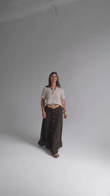 Falda de corte acampanado, confeccionada en puro Lino Italiano. Incluye cinto.