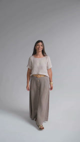 Falda de corte acampanado, confeccionada en puro Lino Italiano. Incluye cinto.