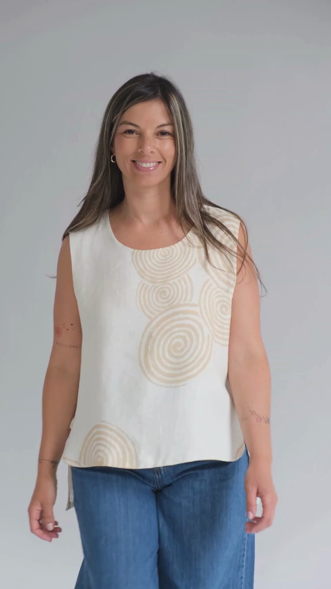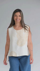 Musculosa de lino italiano con escote redondo, largo desigual y estampado de espirales.