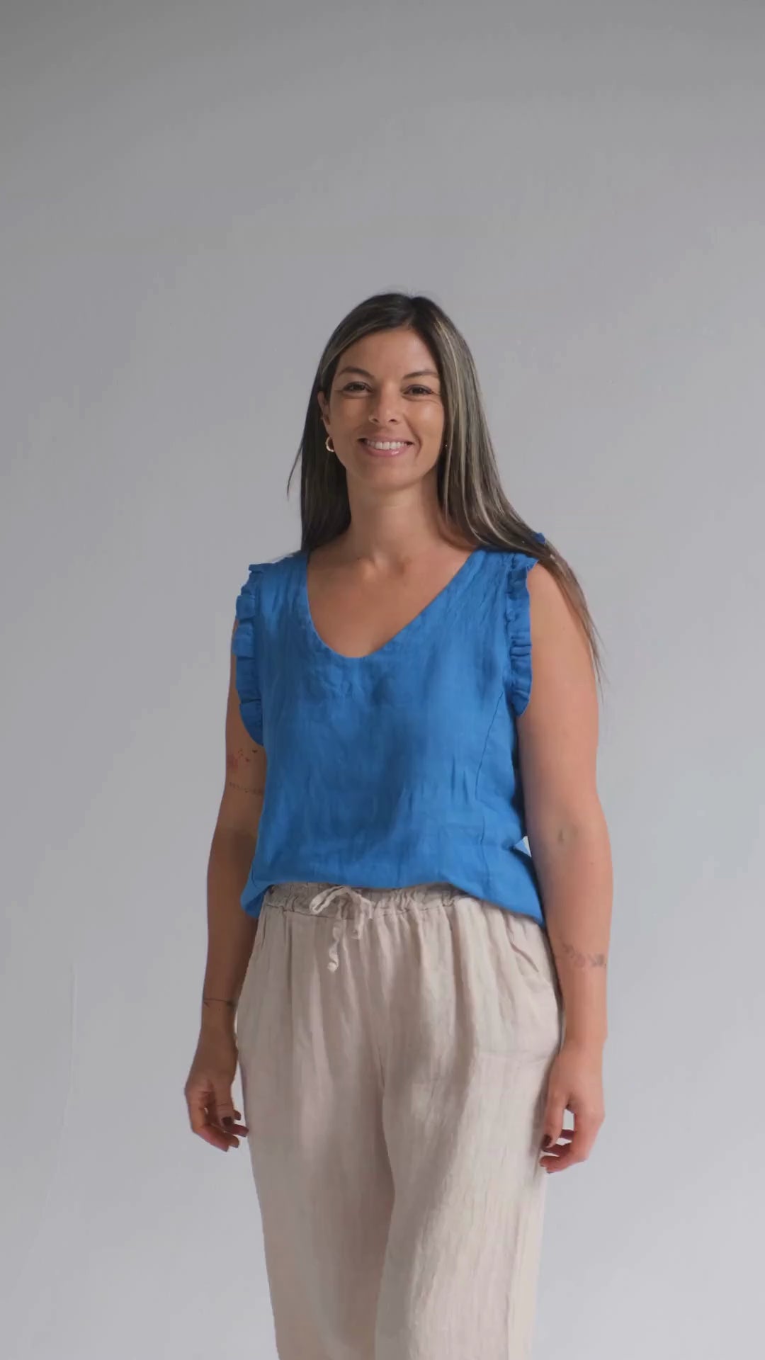 Musculosa de puro lino italiano, con escote en V y volado en las mangas.