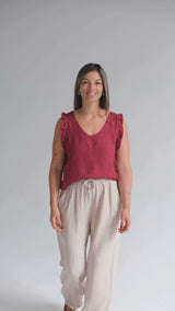 Musculosa de puro lino italiano, con escote en V y volado en las mangas.