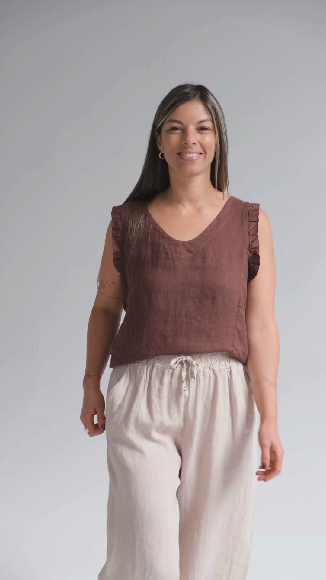 Musculosa de puro lino italiano, con escote en V y volado en las mangas.