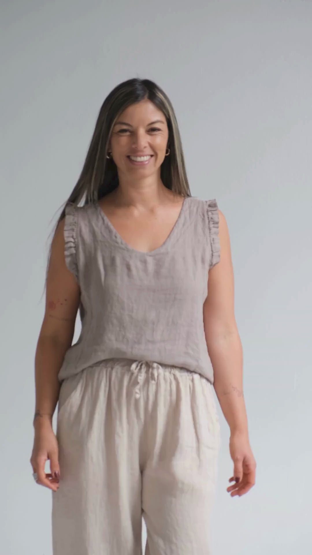 Musculosa de puro lino italiano, con escote en V y volado en las mangas.