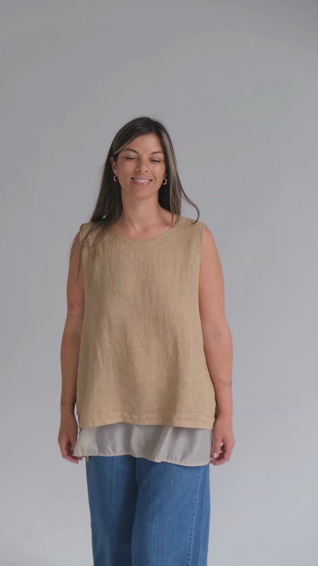Musculosa de puro lino italiano con cuello redondo, ruedo de doble largo y delicada abertura en la espalda.