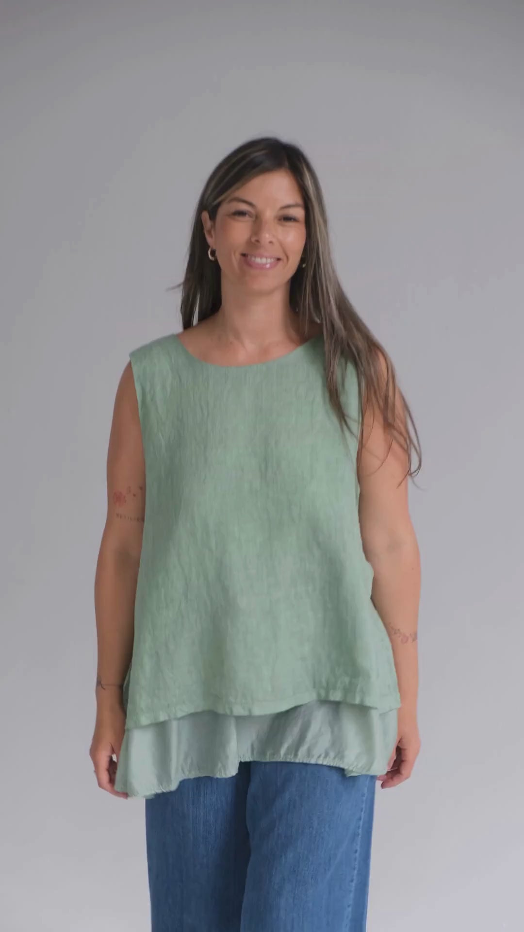Musculosa de puro lino italiano con cuello redondo, ruedo de doble largo y delicada abertura en la espalda.