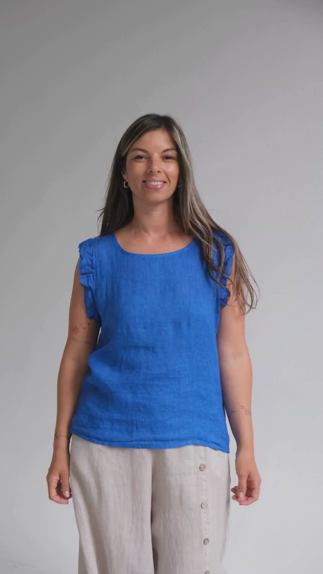 Musculosa con delicado volado en los hombros y botones de nácar en la espalda. Una prenda femenina y fresca.