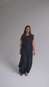 Musculosa con delicado volado en los hombros y botones de nácar en la espalda. Una prenda femenina y fresca.
