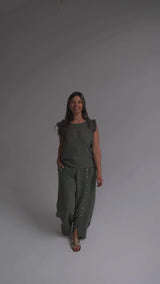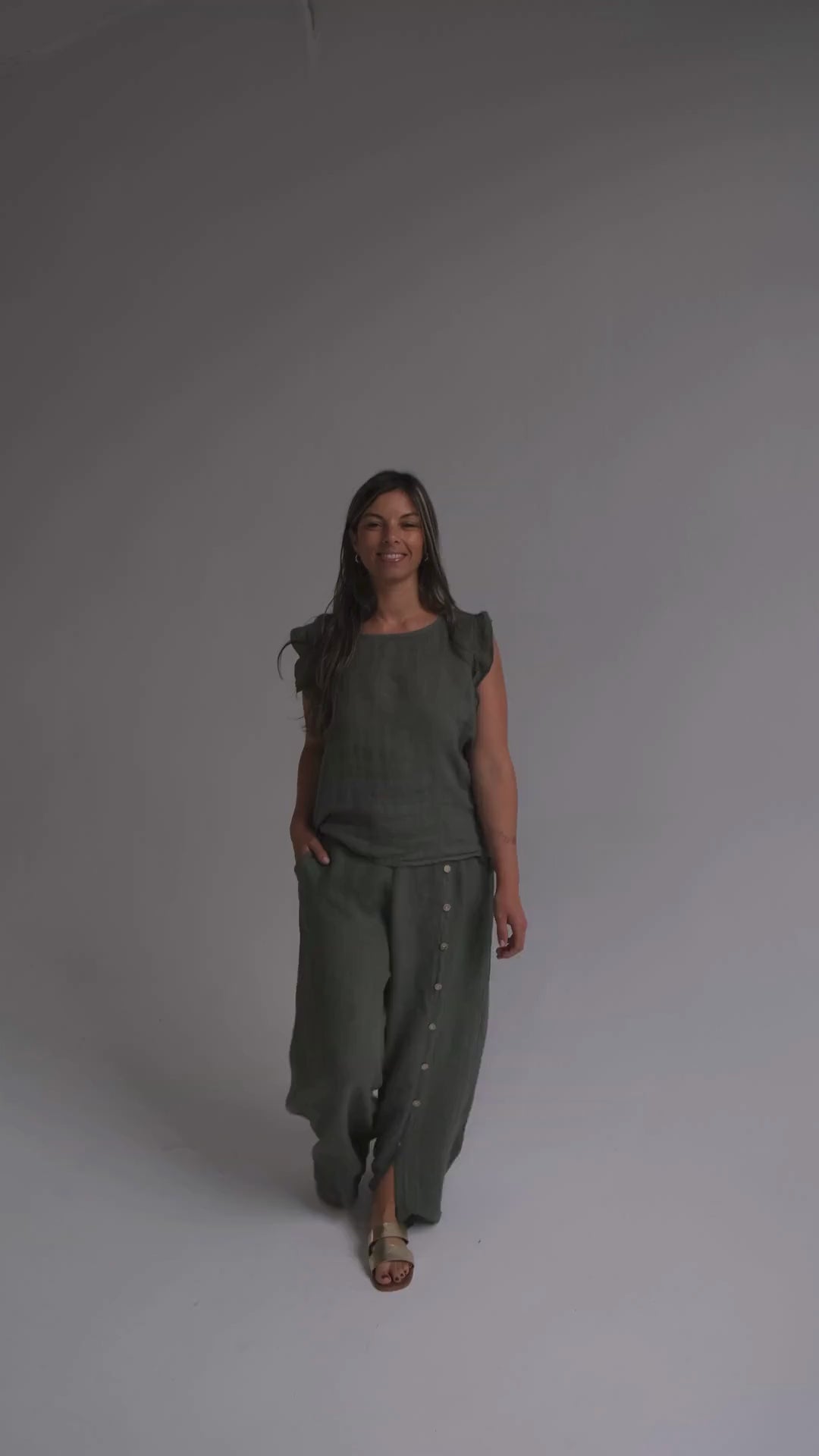 Musculosa con delicado volado en los hombros y botones de nácar en la espalda. Una prenda femenina y fresca.