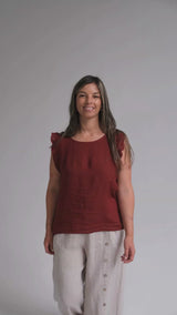 Musculosa con delicado volado en los hombros y botones de nácar en la espalda. Una prenda femenina y fresca.