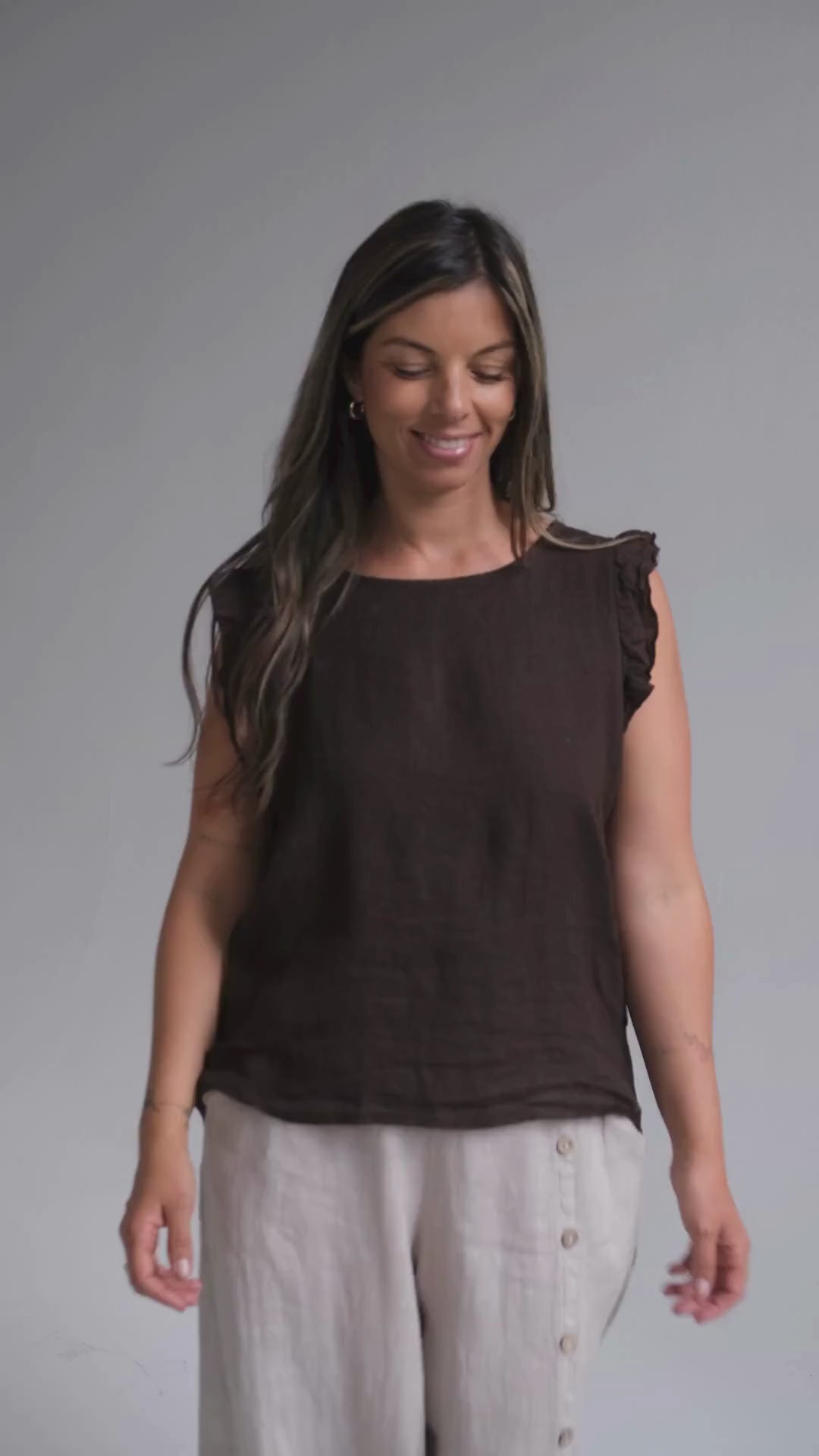 Musculosa con delicado volado en los hombros y botones de nácar en la espalda. Una prenda femenina y fresca.