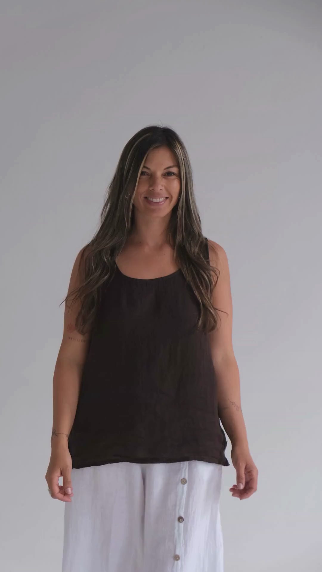 Musculosa 100 % lino italiano con escote redondo y botones de madera en los laterales. Prenda liviana, natural y elegante, ideal para los días de verano.