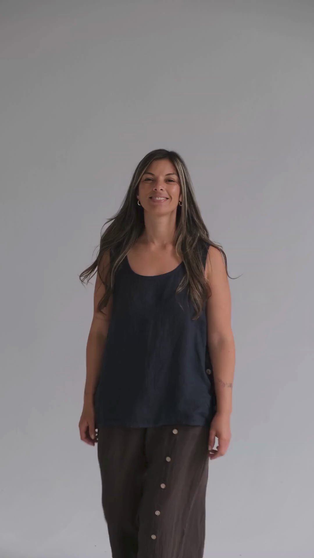 Musculosa 100 % lino italiano con escote redondo y botones de madera en los laterales. Prenda liviana, natural y elegante, ideal para los días de verano.