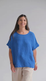 Remera con escote a la base, de corte amplio, confeccionada en puro lino italiano. Cuenta con un delicado detalle en las mangas.