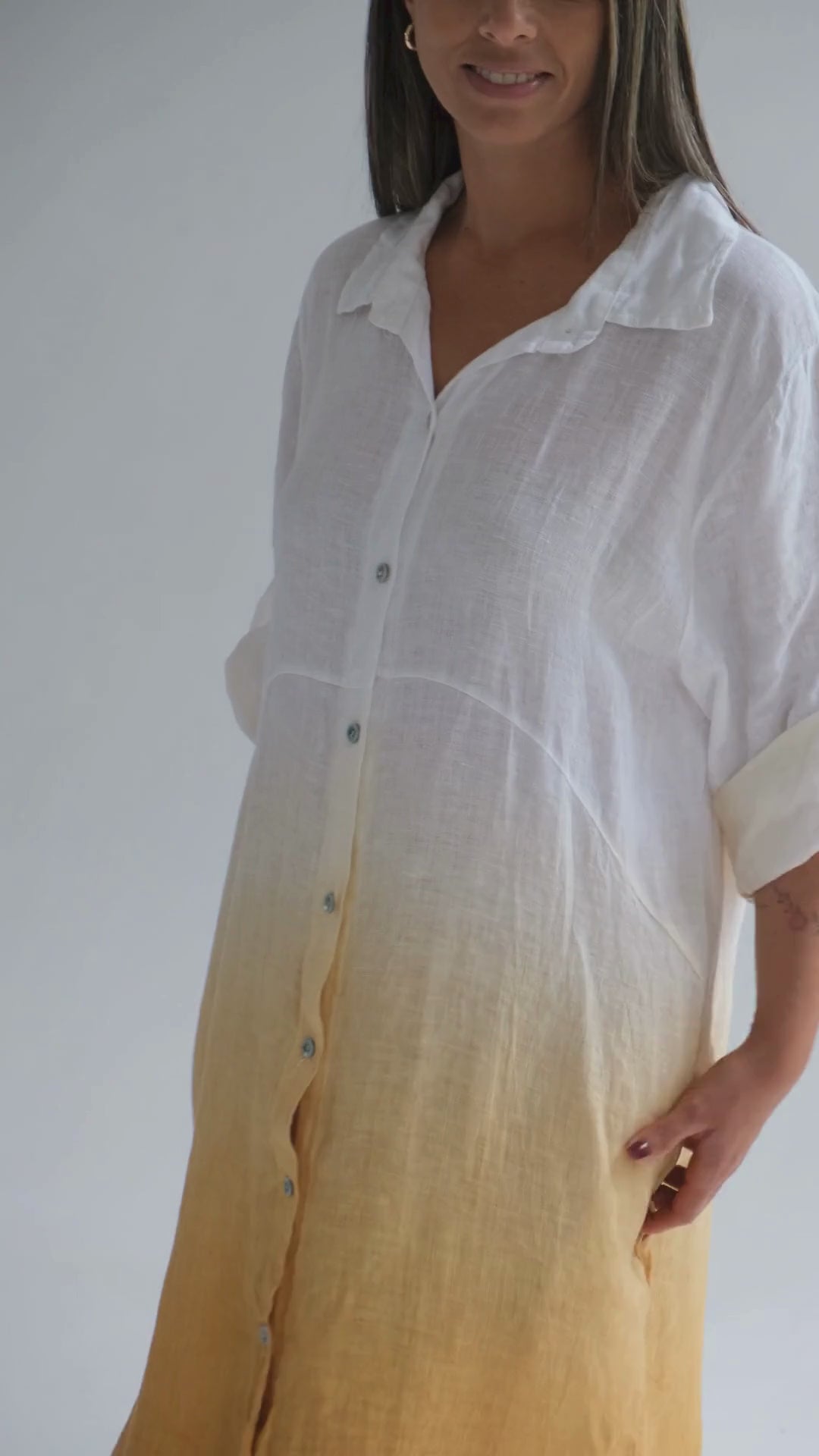 Camisola de corte largo en 100% lino italiano. Degradado sutil en el bajo y manga con botón ajustable. Ligera, elegante y naturalmente sofisticada.