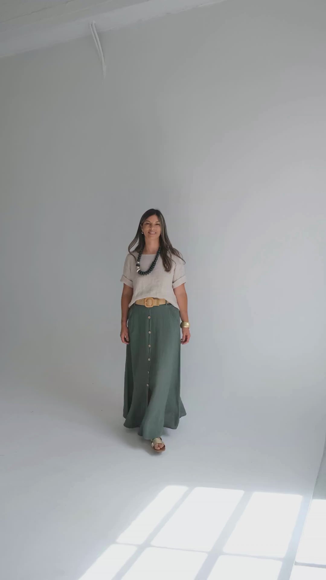 Falda de corte acampanado, confeccionada en puro Lino Italiano. Incluye cinto.