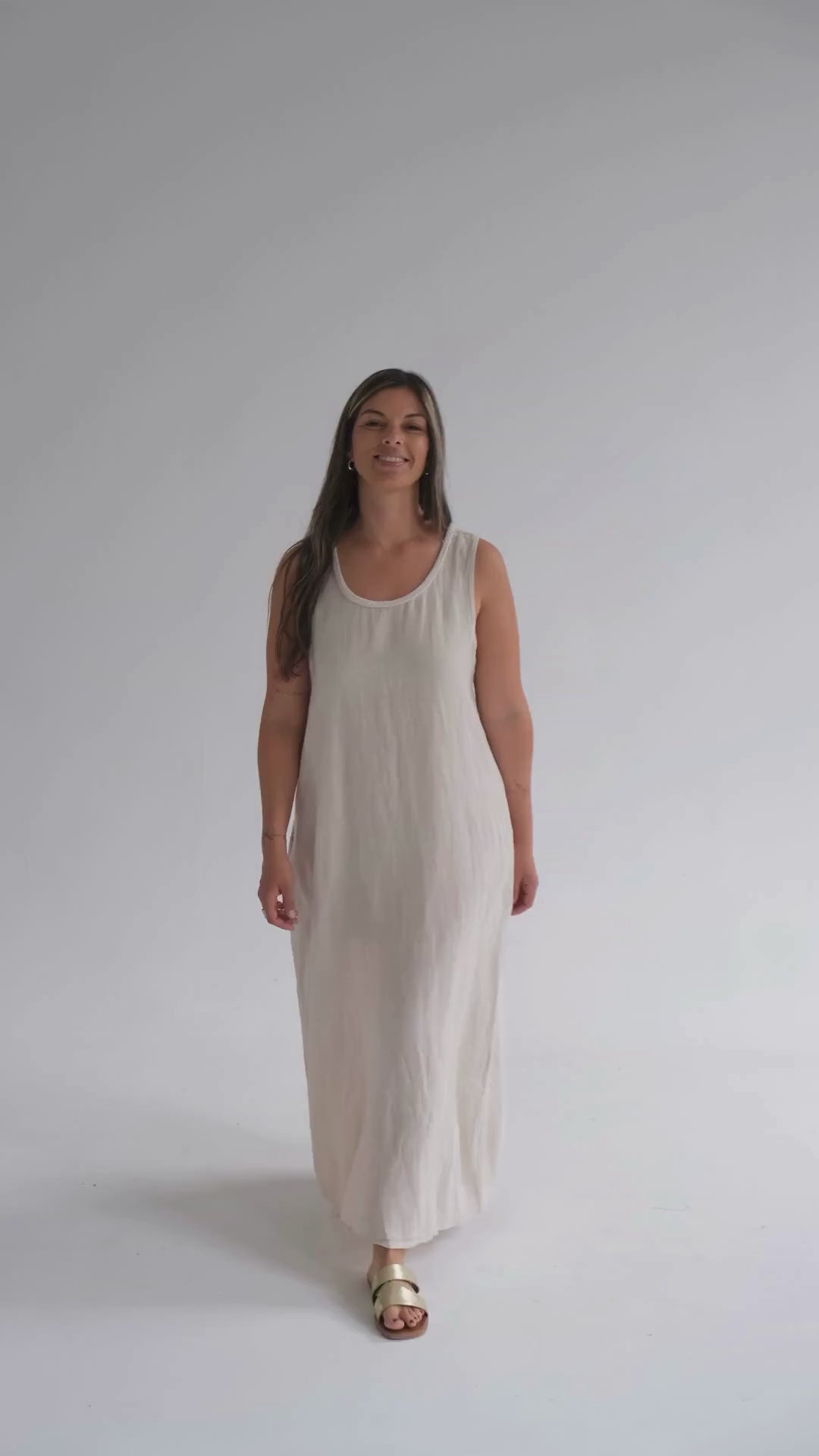 Vestido largo de lino italiano sin mangas, con escote redondo y detalle trenzado que resalta su caída suave. Cuenta con bolsillos en los costados, que aportan comodidad.