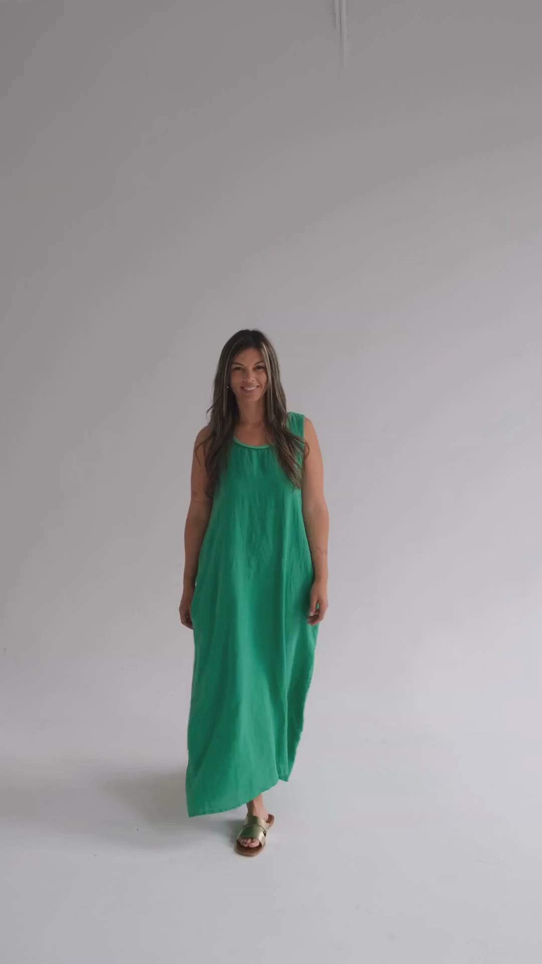 Vestido largo de lino italiano sin mangas, con escote redondo y detalle trenzado que resalta su caída suave. Cuenta con bolsillos en los costados, que aportan comodidad.