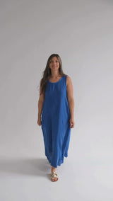 Vestido largo de lino italiano sin mangas, con escote redondo y detalle trenzado que resalta su caída suave. Cuenta con bolsillos en los costados, que aportan comodidad.
