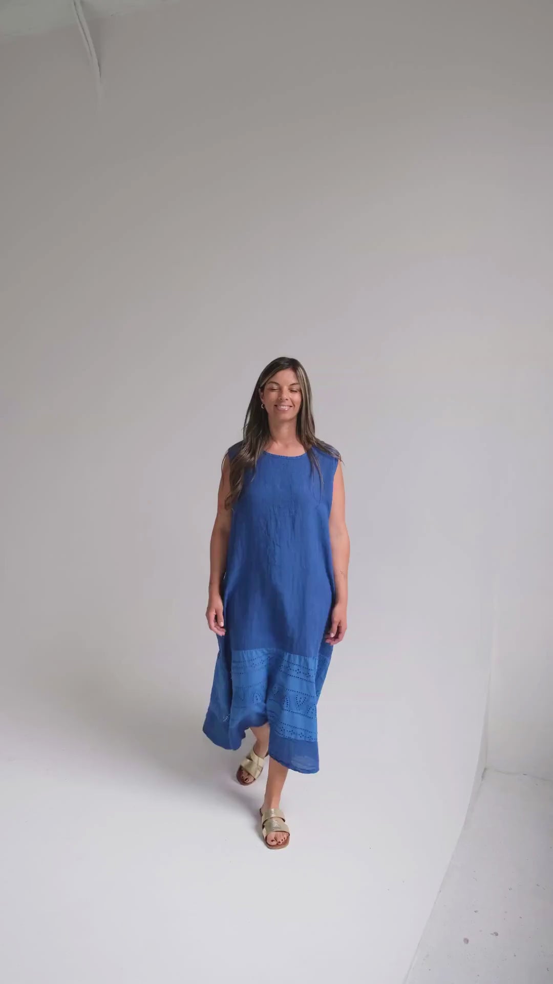 Vestido en 100% lino italiano, con el largo de corte acampanado tiene una silueta ligera y fluida. El detalle de franja en broderie aporta un toque sutil y delicado.