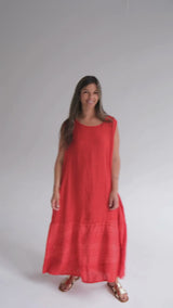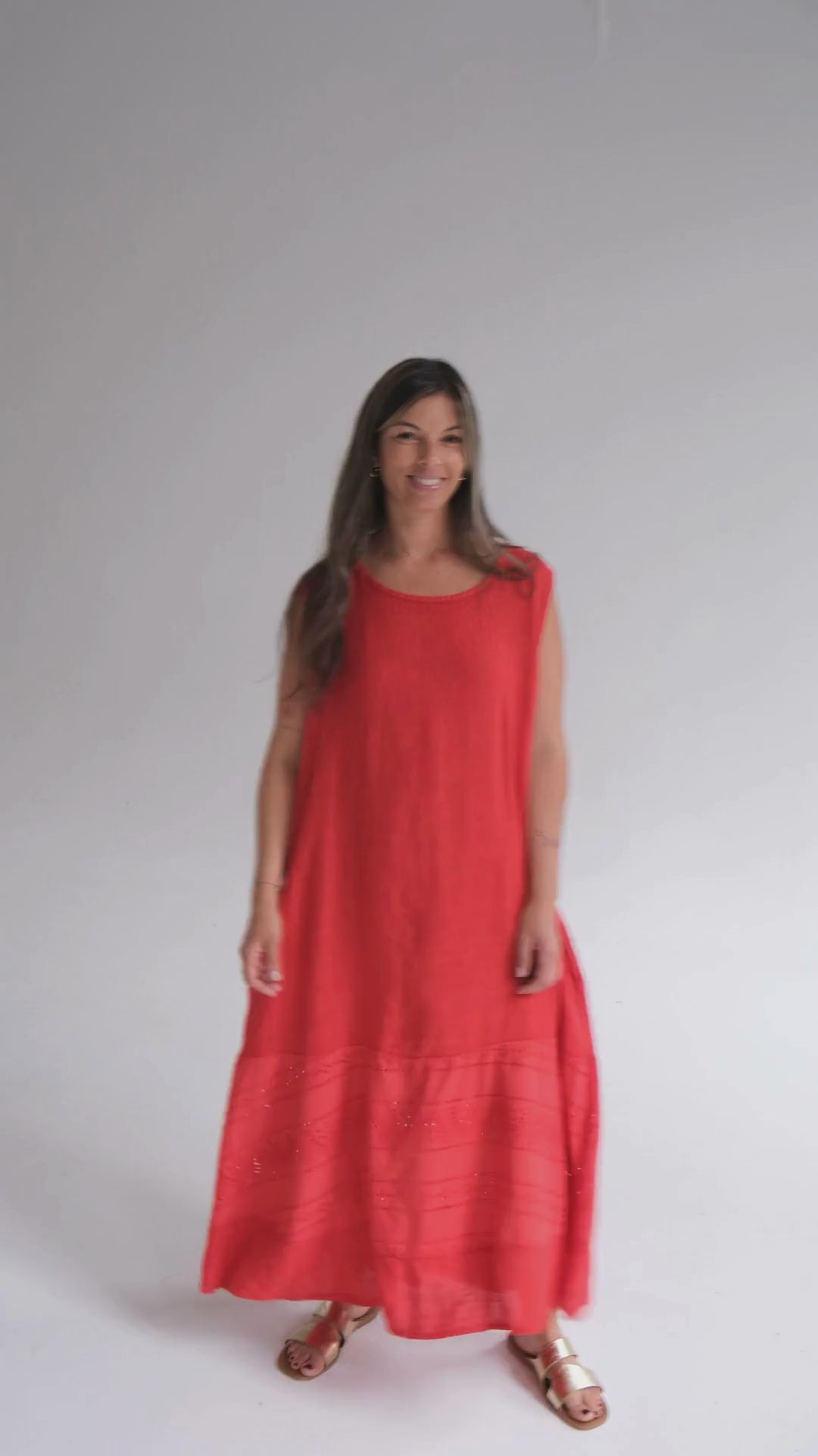 Vestido en 100% lino italiano, con el largo de corte acampanado tiene una silueta ligera y fluida. El detalle de franja en broderie aporta un toque sutil y delicado.